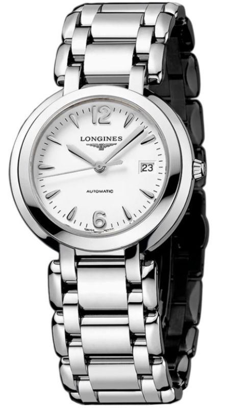 Model: L8.113.4.16.6 - CASE = [Material:Stainless Steel], [Case Diameter:30], [Bezel:Fixed], [Case Back:Solid], [Water Resistant:30 Meters - 100 Feet], [Crystal:Scratch Resistant Sapphire], DIAL = [Color:White Dial with Index Hour Markers], MOVEMENT = [Type:Automatic], [Crown:Push In], BAND = [Clasp:Folding], [Type:Stainless Steel], (In Stock - Ready to ship.)