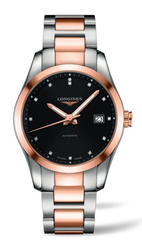 Model: L2.785.5.58.7 - CASE = [Material:Stainless Steel and 18kt Rose Gold], [Case Diameter:40], [Case Back:Skeleton], [Water Resistant:50 Meters - 165 Feet], [Crystal:Scratch Resistant Sapphire], DIAL = [Color:Black with Luminescent Rose Gold Hands and Diamond Hour Markers], MOVEMENT = [Type:Automatic], BAND = [Clasp:Folding], [Type:Stainless Steel and 18kt Rose Gold], (Usually ships in 1 to 2 weeks.)