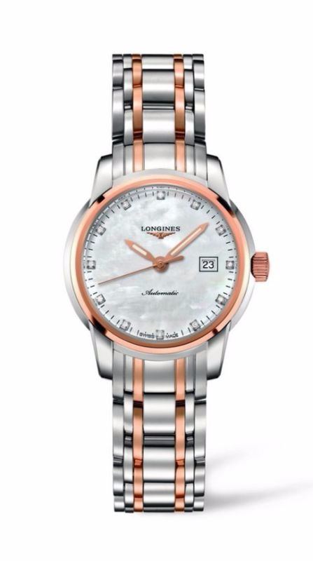 Model: L2.563.5.88.7 - CASE = [Material:Stainless Steel and 18kt Rose Gold], [Case Diameter:30], [Case Thickness:9.5mm], [Bezel:Fixed], [Case Back:Skeleton], [Water Resistant:50 Meters - 165 Feet], [Crystal:Scratch Resistant Sapphire],; DIAL = [Color:White Mother of Pearl with Rose Gold Luminescent Hands and Diamond Hour Markers],; MOVEMENT = [Type:Automatic], [Crown:Push In],; BAND = [Clasp:Deployment], [Type:Stainless Steel and 18kt Rose Gold], (Usually ships in 1 to 2 weeks.)