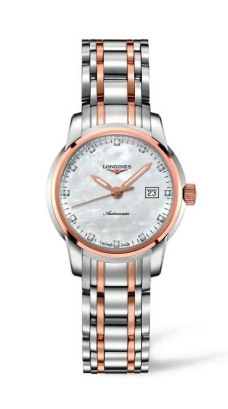 Model: L2.563.5.88.7 - CASE = [Material:Stainless Steel and 18kt Rose Gold], [Case Diameter:30], [Case Thickness:9.5mm], [Bezel:Fixed], [Case Back:Skeleton], [Water Resistant:50 Meters - 165 Feet], [Crystal:Scratch Resistant Sapphire], DIAL = [Color:White Mother of Pearl with Rose Gold Luminescent Hands and Diamond Hour Markers], MOVEMENT = [Type:Automatic], [Crown:Push In], BAND = [Clasp:Deployment], [Type:Stainless Steel and 18kt Rose Gold], (Usually ships in 1 to 2 weeks.)