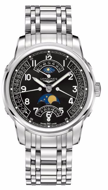 Model: L2.764.4.53.6 - CASE = [Material:Stainless Steel], [Case Diameter:44], [Bezel:Stainless Steel], [Case Back:Skeleton], [Water Resistant:30 Meters - 100 Feet], [Crystal:Scratch Resistant Sapphire],; DIAL = [Color:Black],; MOVEMENT = [Type:Automatic Moon Phase], [Crown:Push in],; BAND = [Clasp:Hidden Folding Clasp], [Type:Stainless Steel], (Usually ships in 1 to 2 weeks.)