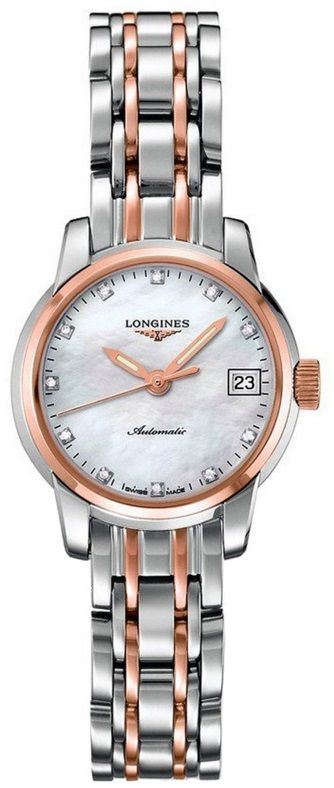 Model: L2.263.5.88.7 - CASE = [Material:Stainless Steel and Rose Gold], [Case Diameter:26], [Case Thickness:9mm], [Bezel:Fixed], [Case Back:Skeleton], [Water Resistant:30 Meters - 100 Feet], [Crystal:Scratch Resistant Sapphire], DIAL = [Color:Mother of Pearl], MOVEMENT = [Type:Automatic], [Crown:Push In], BAND = [Clasp:Folding], [Type:Stainless Steel and Rose Gold], (Usually ships in 1 to 2 weeks.)