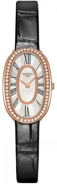 Model: L2.305.9.81.0 - CASE = [Material:18kt Rose Gold], [Case Diameter:18.9], [Case Thickness:5.85mm], [Bezel:Fixed], [Case Back:Solid], [Water Resistant:30 Meters - 100 Feet], [Crystal:Scratch Resistant Sapphire], DIAL = [Color:Mother of Pearl], MOVEMENT = [Type:Quartz], [Crown:Push In], BAND = [Clasp:Tang], [Type:Black Leather], (Usually ships in 1 to 2 weeks.)