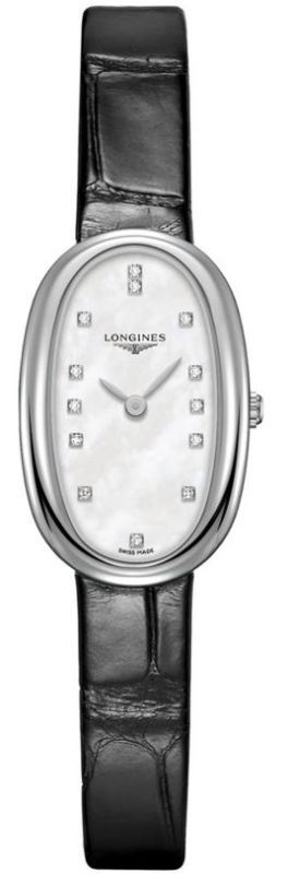 Model: L2.305.4.87.0 - CASE = [Material:Stainless Steel], [Case Diameter:18.9], [Case Thickness:5.85mm], [Bezel:Fixed], [Case Back:Solid], [Water Resistant:30 Meters - 100 Feet], [Crystal:Scratch Resistant Sapphire], DIAL = [Color:Mother of Pearl], MOVEMENT = [Type:Quartz], [Crown:Push In], BAND = [Clasp:Tang], [Type:Black Leather], (Usually ships in 1 to 2 weeks.)