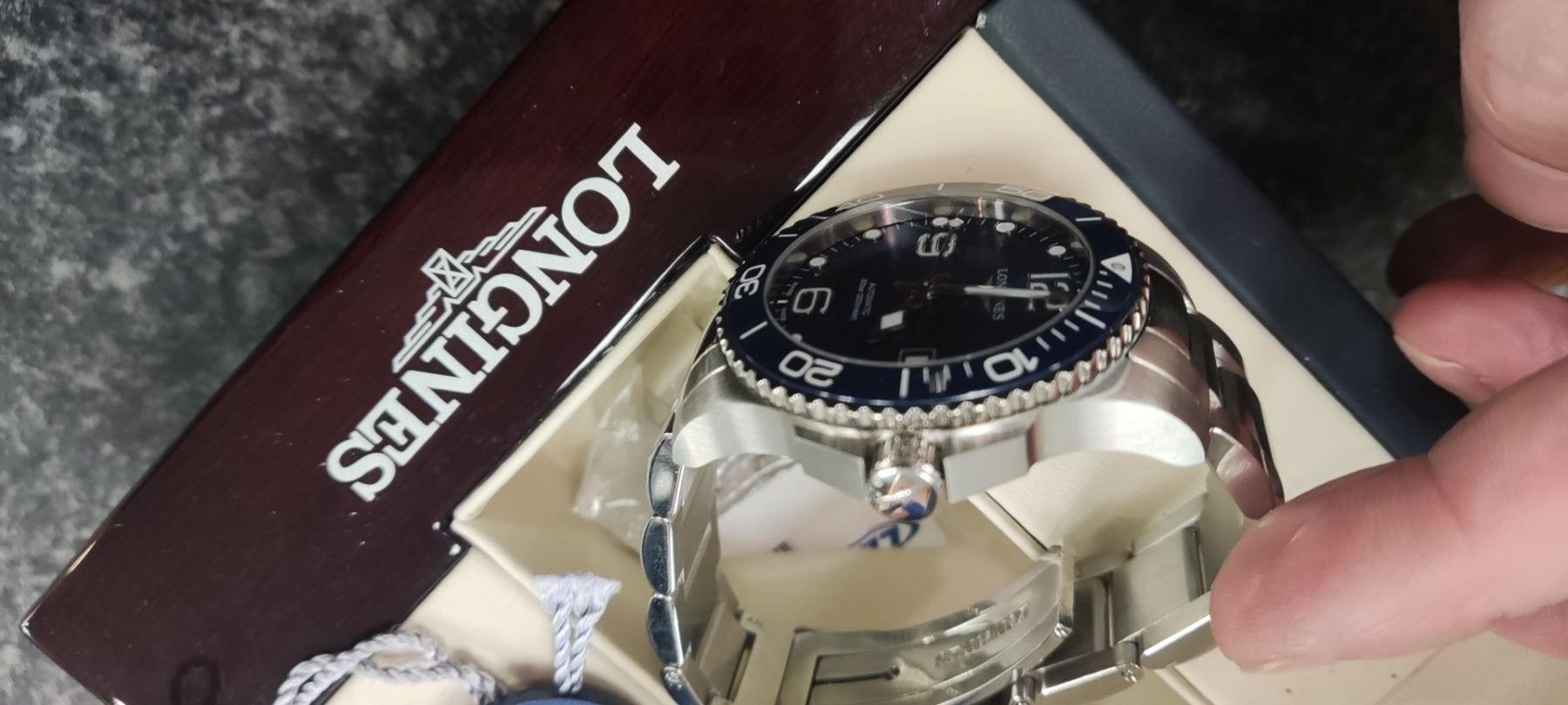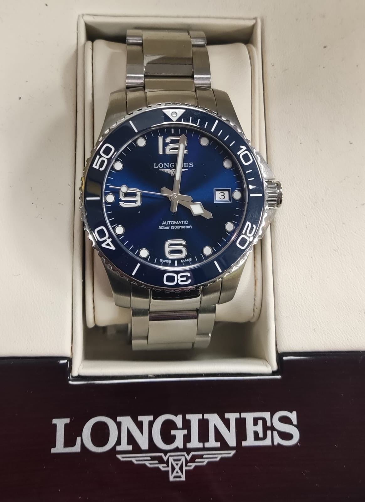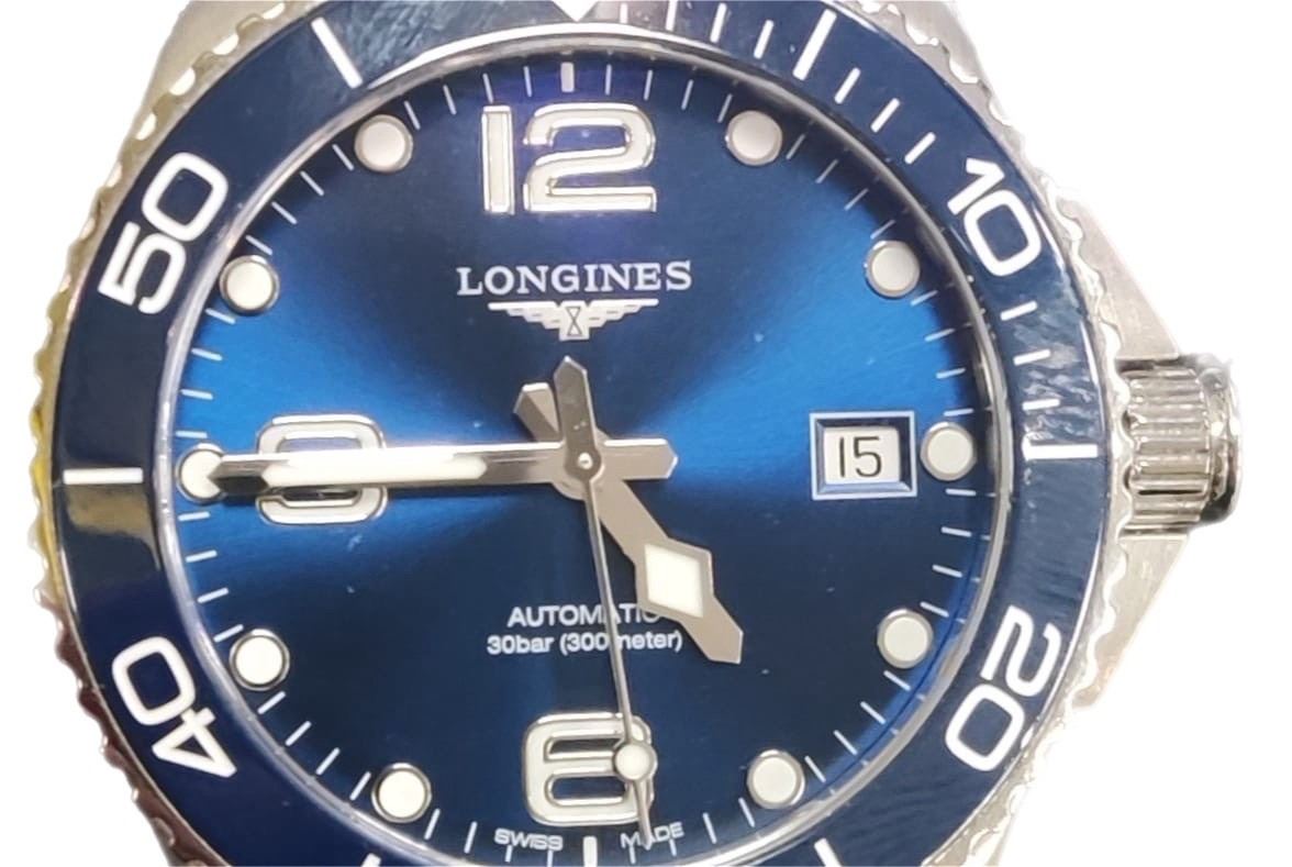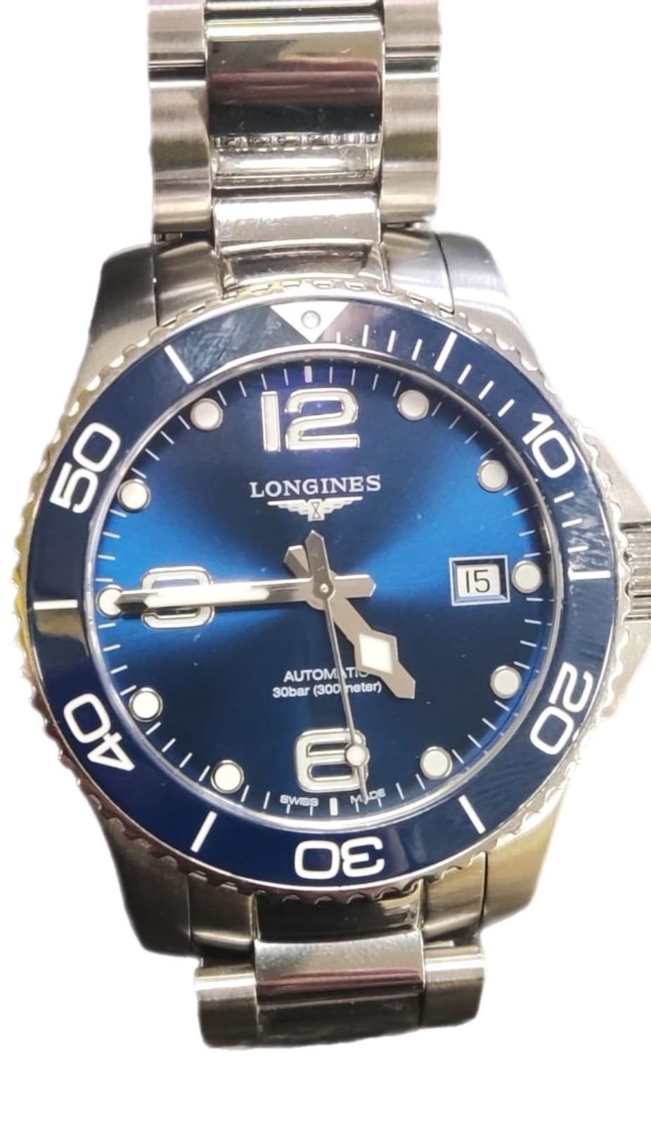 This Longines HydroConquest 41mm Mens Watch L3.781.3.56.7 features a 41mm case, beautifully crafted from stainless-steel with a ceramic, unidirectional rotating bezel. The matt black dial features a date window at the 3 o’clock complemented by yellow gold coloured hands. Powered by an automatic, self-winding mechanical movement, with a power reserve of approximately 72 hours. Presented on a stainless-steel and yellow gold bracelet strap with folding clasp.