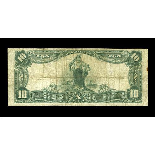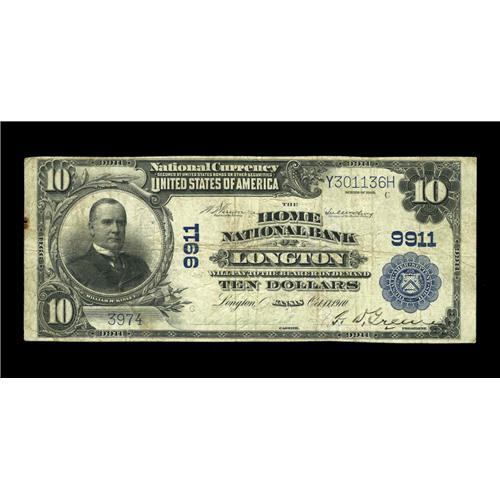 <B>Longton, KS</B></I> - $10 1902 Plain Back Fr. 627 <B>The Home NB</B></I> Ch. # 9911<BR>This is a very rare bank in large size, with this only the third example reported from here. While small notes are occasionally available, the last large example from this bank available to the collecting public was offered in 1996, when the Lyon collection was dispersed. <B>Fine++,</B></I> with a tiny rust spot far out in the left margin.