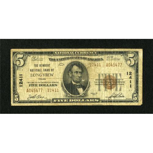 <B>Longview, TX</B></I> - $5 1929 Ty. 2 <B>The Rembert NB</B></I> Ch. # 12411<BR> The only denomination issued by this east Texas bank, this <B>Fine</B></I> example is the highest serial number currently reported on a Type 2 note for this institution.<BR><BR><b>Shipping:</b> Coins & Currency (<a target="_blank" href="http://www.heritageauctions.com/common/shipping.php">view shipping information</a>)