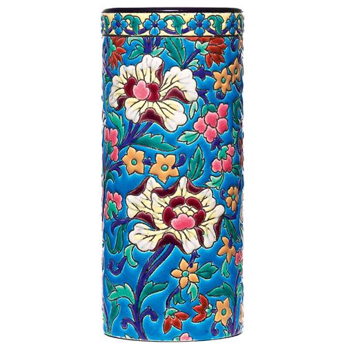 Longwy vase, cylindrical form with a brightly colored floral design, stamped mark, 7.25"h