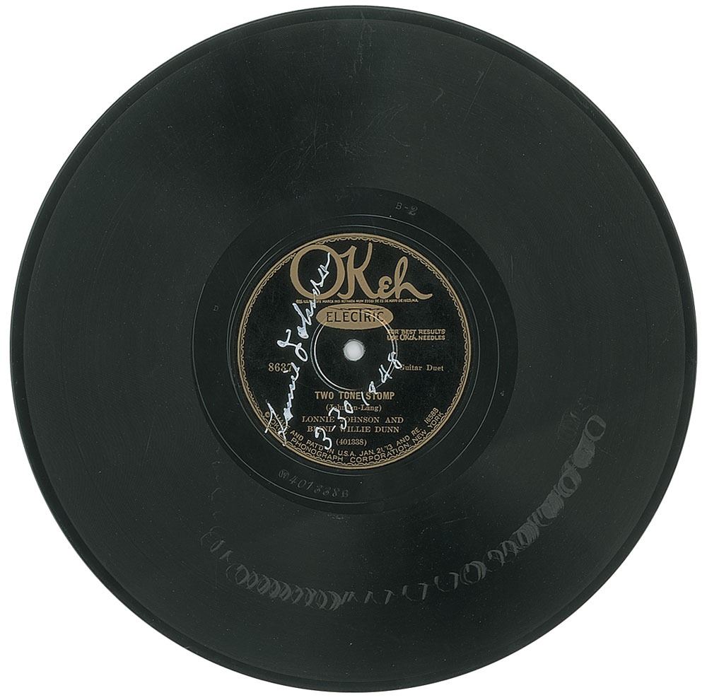 Okeh Records 78 RPM record for the Lonnie Johnson and Blind Willie Dunn single 'Have to Change Keys to Play the Blues / Two Tone Stomp,' signed on the side B label in white ink, "Lonnie Johnson, 3-30-1948." In very good to fine condition, with scuffs and markings to side B grooves.