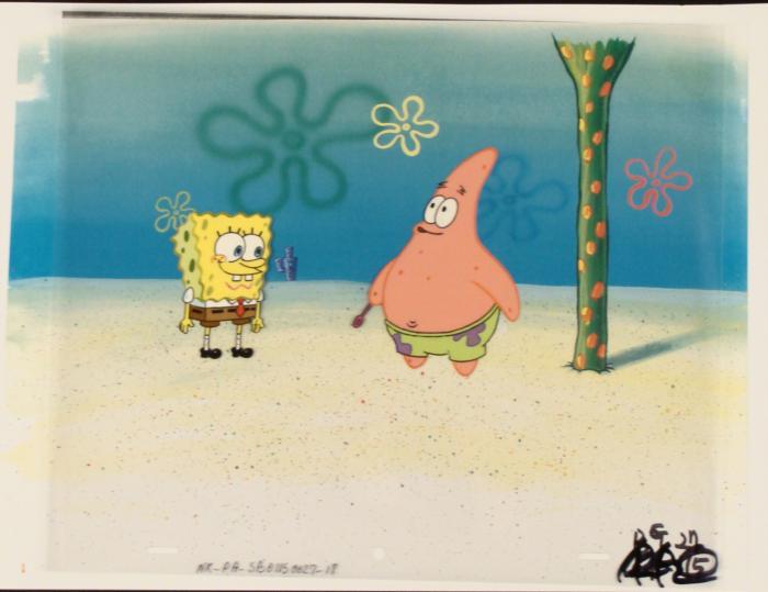 This animation cel and reproduction background are from the Nickelodeon TV show SpongeBob Squarepants. The story takes place under the deep blue sea in Bikini Bottom, where SpongeBob resides. SpongeBob, who is a yellow, porous sponge, is your typical happy-go-lucky character, as he is always cheerful and enjoys making people laugh. Patrick Star, SpongeBob's neighbor who is a starfish, is your average children's show idiot, as he boasts knowing nothing and is often getting himself into ridiculous situations. Between the homes of these two lies the home of the miserable Squidward, a squid, who is known for being grouchy and playing tricks on SpongeBob and Patrick. Both SpongeBob and Squidward work at the Krusty Krab, a fast food business run by the greedy money-loving Mr. Krabs, a crab, the arch rival of the evil, possibly misunderstood, Plankton. Another neighbor, Sandy Cheeks, an athletic squirrel who normally wears an astronaut's space suit, was introduced in "Tea at the Treedome." She spends most of her time inventing and experimenting. What is Patrick looking at?Original Printed Background and Animated Cel Overall Size of Background: 11" x 17" Overall Size of the Cel: 10 1/2" x 12 1/2" Very good condition This is an original hand-painted cel set-up used in the production of an episode of "SpongeBob SquarePants." Each one-of-a-kind set-up represents a slight change in position of the characters. When individually photographed and projected in rapid succession, the images appear to move.