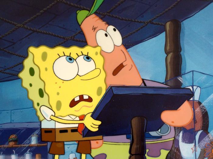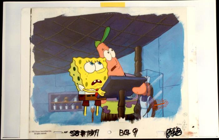 This animation cel and reproduction background are from the Nickelodeon TV show SpongeBob Squarepants. The story takes place under the deep blue sea in Bikini Bottom, where SpongeBob resides. SpongeBob, who is a yellow, porous sponge, is your typical happy-go-lucky character, as he is always cheerful and enjoys making people laugh. Patrick Star, SpongeBob's neighbor who is a starfish, is your average children's show idiot, as he boasts knowing nothing and is often getting himself into ridiculous situations. Between the homes of these two lies the home of the miserable Squidward, a squid, who is known for being grouchy and playing tricks on SpongeBob and Patrick. Both SpongeBob and Squidward work at the Krusty Krab, a fast food business run by the greedy money-loving Mr. Krabs, a crab, the arch rival of the evil, possibly misunderstood, Plankton. Another neighbor, Sandy Cheeks, an athletic squirrel who normally wears an astronaut's space suit, was introduced in "Tea at the Treedome." She spends most of her time inventing and experimenting. What is Patrick and SpongeBob looking at?Original Printed Background and Animated Cel Overall Size of Background: 11" x 17" Overall Size of the Cel: 10 1/2" x 12 1/2" Very good condition This is an original hand-painted cel set-up used in the production of an episode of "SpongeBob SquarePants." Each one-of-a-kind set-up represents a slight change in position of the characters. When individually photographed and projected in rapid succession, the images appear to move.
