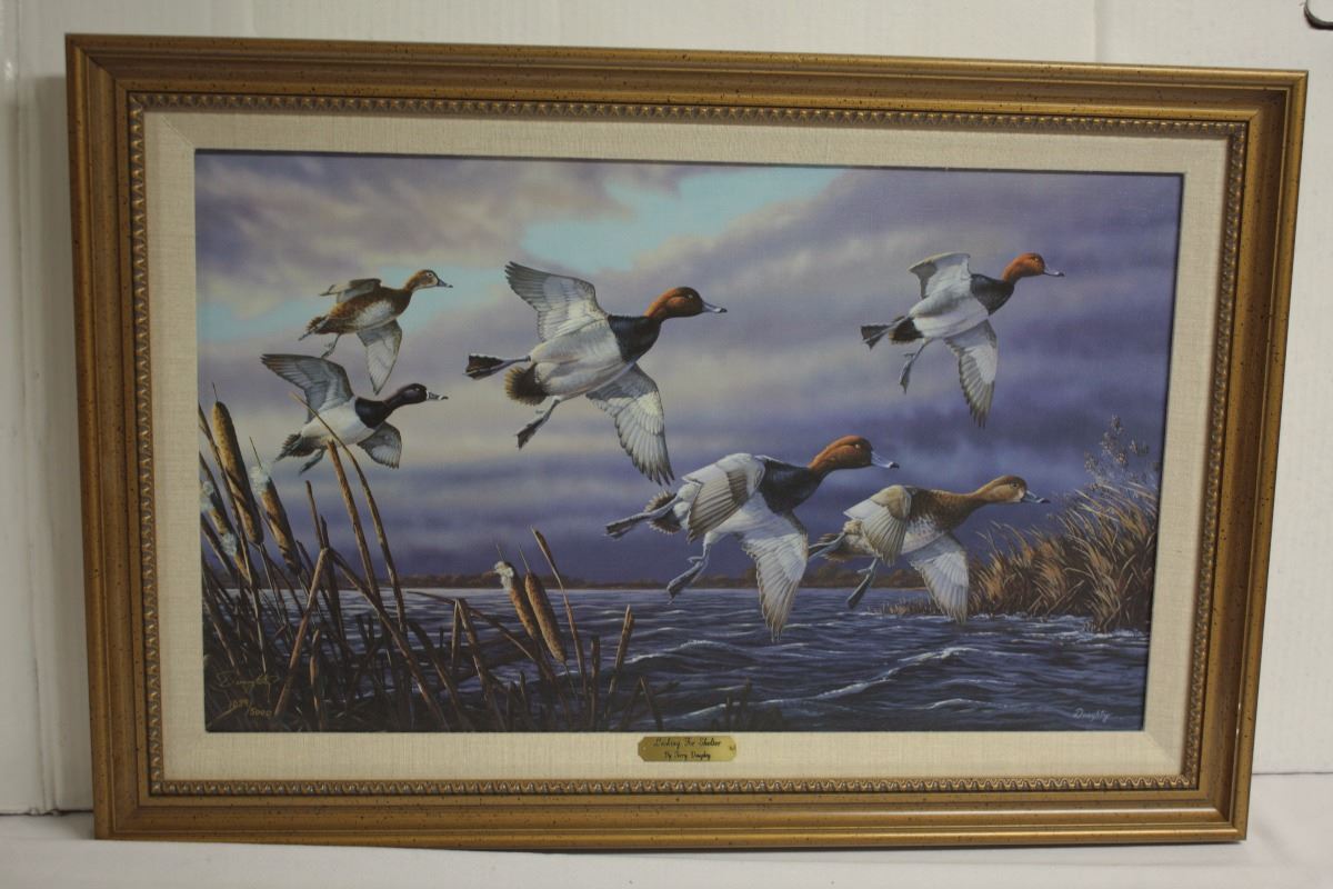 A Ducks Unlimited print on canvas titled 'Looking for shelter'
