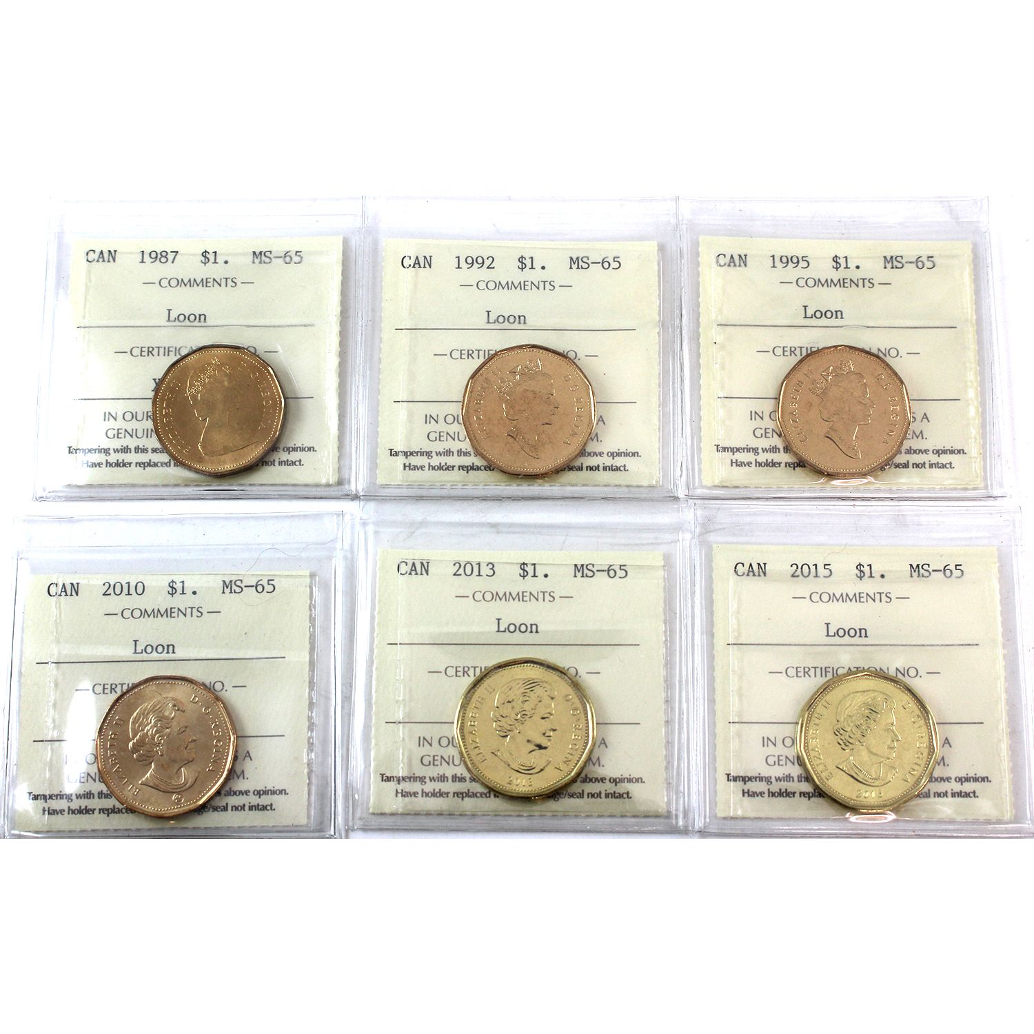 Loon $1 1987, 1992, 1995, 2010, 2013 & 2015 ICCS MS65. 6pcs.