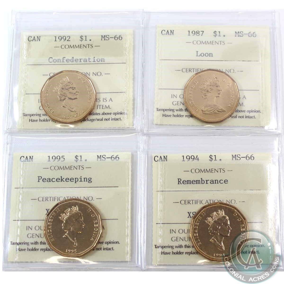 Loon $1 1987, 1992 Confederation, 1994 Remembrance & 1995 Peacekeeping ICCS Certified MS-66. 1995 Peacekeeping is tied for finest known. 4pcs