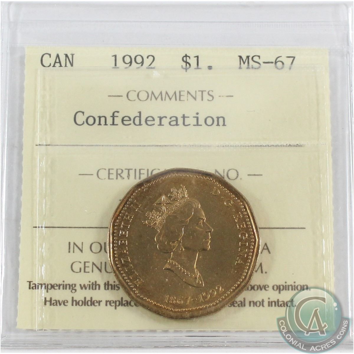 Loon $1 1992 Confederation ICCS Certified MS-67. Top 4, Highest grade by ICCS.