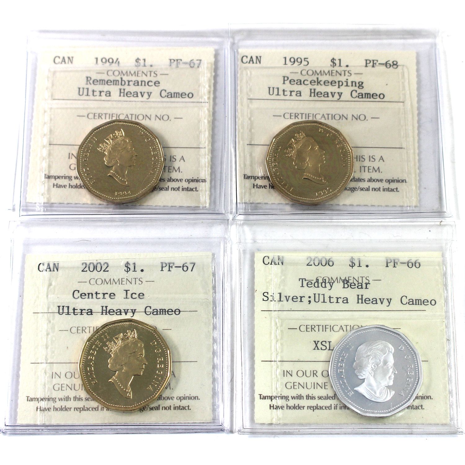 INCLUDES: 1994 Remembrance PF67, 1995 Peace Keeping PF68, 2002 Centre Ice PF67 & 2006 Teddy Bear Sterling Silver PF66. 4pcs.