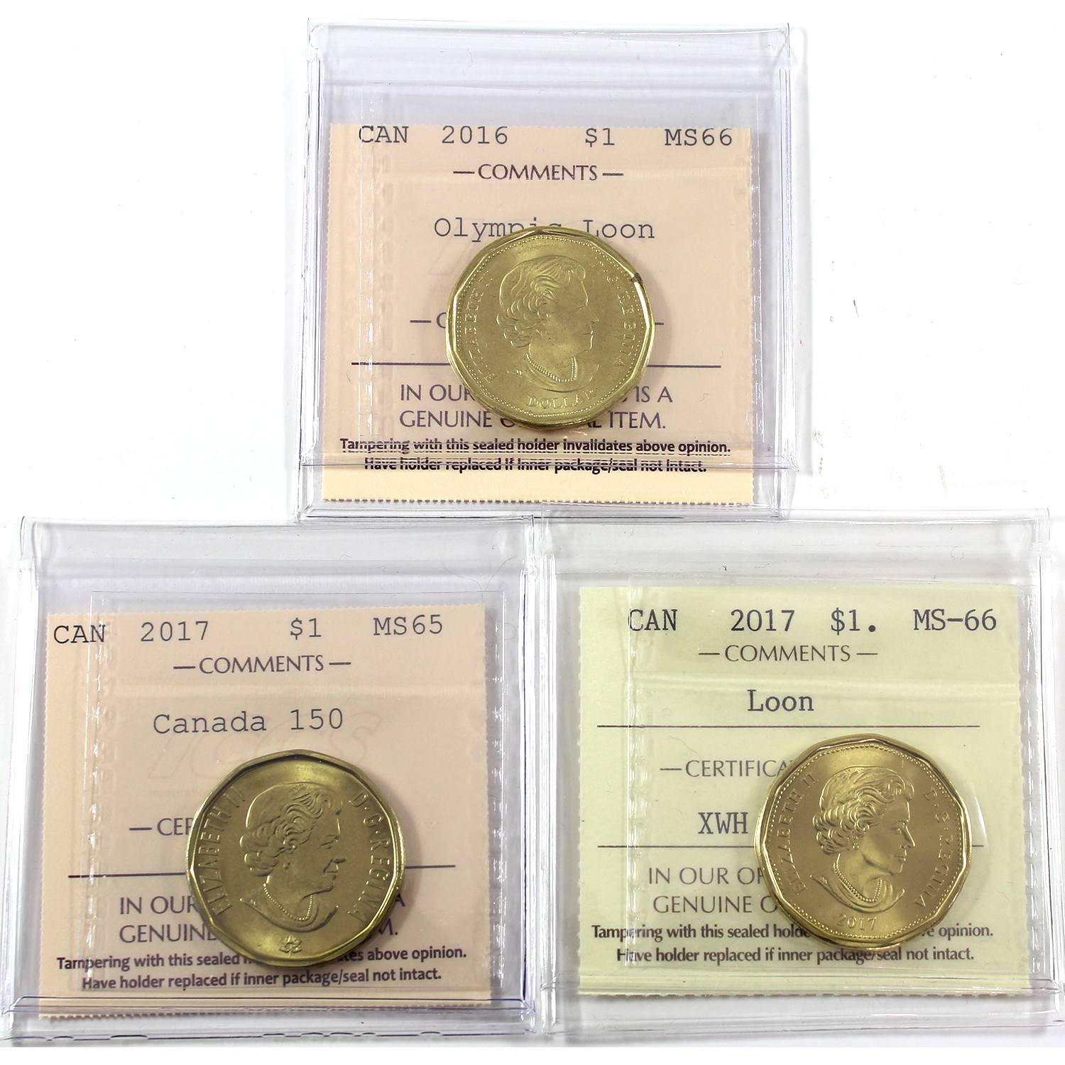 INCLUDES: 2016 Olympic Loon MS66, 2017 MS66, & 2017 Canada 150 MS65. 3pcs.