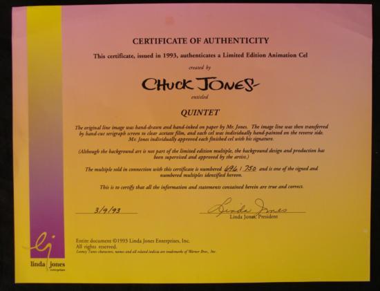 This Looney Tunes animation sericel was hand signed by the great Chuck Jones. This Quintet of Looney musicians is certainly creating some interesting music. A few of them seem a little distracted. Note that the first, second, and third strings are all played by one Bugs Bunny!