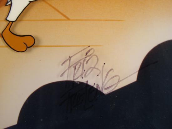 Medium: Sericel Presentation: Custom framed, triple matted in white, blue and dark red; black plastic coated wood frame Signature: Signed in black Sharpie by Friz Freleng, lower right Edition: Numbered 851/1200, lower left Image size: 12 1/4 x 22 1/4 inches Frame size: 20 1/2 x 30 inches Authentication: Warner Brothers seal, upper right corner; Certificate of Authentication from Midwest Estate Buyers Year published: 1992 Condition: Excellent; some small nicks on the frame