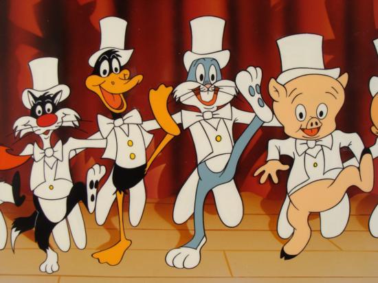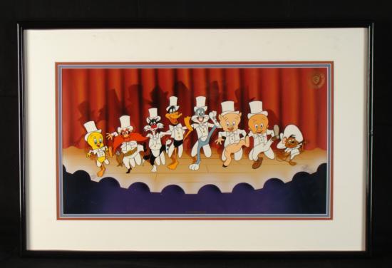 This Looney Tunes animation sericel was hand signed by the fabulous Friz Freleng. This is the chorus line, and it reminds everyone of the classic Looney Tunes intro "On With the Show!" Eight favorite characters are here, all on stage in white tuxedos.