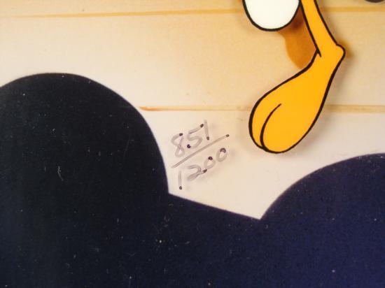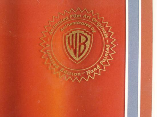 Medium: Sericel Presentation: Custom framed, triple matted in white, blue and dark red; black plastic coated wood frame Signature: Signed in black Sharpie by Friz Freleng, lower right Edition: Numbered 851/1200, lower left Image size: 12 1/4 x 22 1/4 inches Frame size: 20 1/2 x 30 inches Authentication: Warner Brothers seal, upper right corner; Certificate of Authentication from Midwest Estate Buyers Year published: 1992 Condition: Excellent; some small nicks on the frame