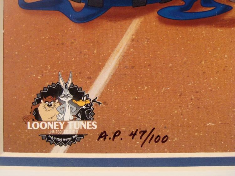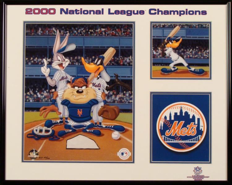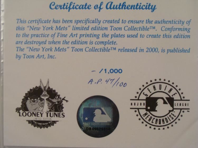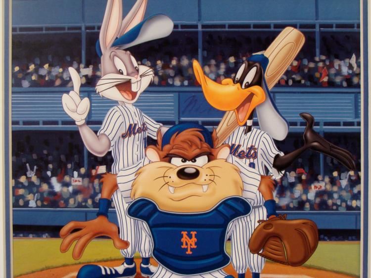 Here the toon squad, consisting of Bugs Bunny, Daffy Duck, and the Tasmanian Devil are all ready to hit the field in their New York Mets uniforms. Medium: Lithograph print on paper Frame Size: 16" x 20" Matted: Blue and WhiteFraming: Black plastic frame Edition: A.P. 47/100 Publisher: Toon Art, Inc Certification: Looney Tunes Date: 2000 Condition: Excellent, minor detachment to right corner of frame