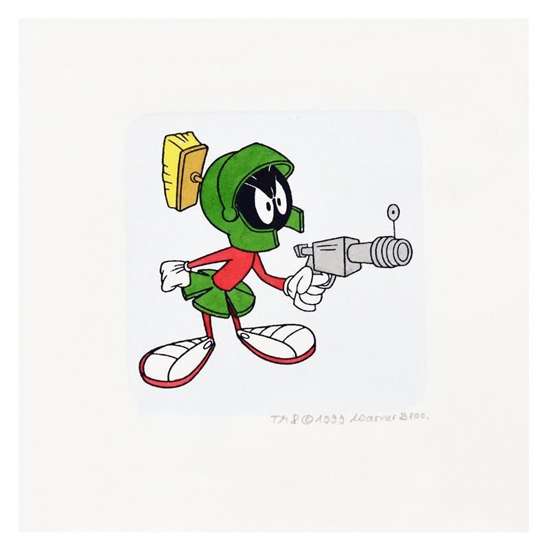 "Marvin the Martian" is a limited edition etching on paper with hand-tinted coloring from Warner Bros, numbered and dated 1999. This piece comes framed. Measures approximately 14" x 14" (with frame), 2.5" x 2.5" (image).