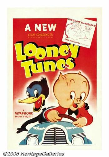 <B>Looney Tunes (Warner Brothers, 1940).</B></I> One Sheet (27" X 41"). This poster for the Warner Brothers Looney Tunes shorts features Porky Pig and an early version of Daffy Duck. There is an original Warner Brothers snipe showing artwork and the title for the specific cartoon, "Joe Glow, the Firefly." Joe Glow, the firefly (Mel Blanc), wanders around one night inside a camper's tent. He explores all the camper's gear, which, to him, is gigantic. There is some fold separation, small holes and a border chip. These defects were professionally restored, giving the poster a very clean appearance. A marvelous example of vintage animation art, this is the rare "Leon Schlesinger" version of this one sheet. Fine/Very Fine on Linen.