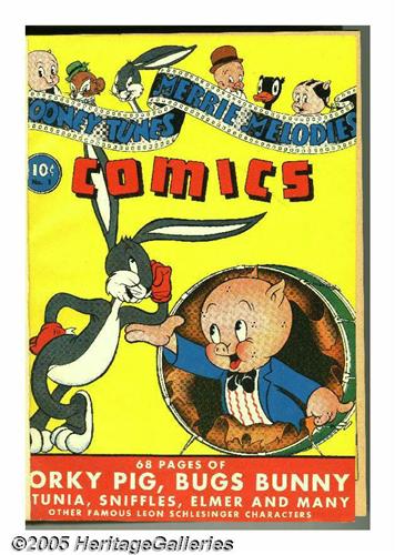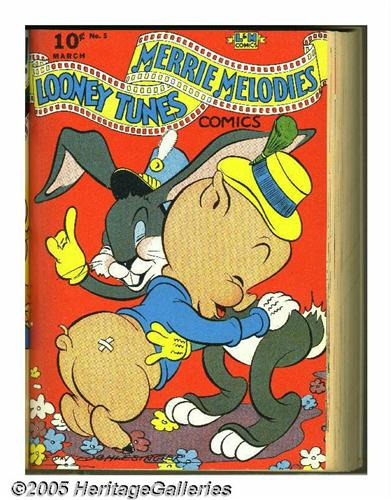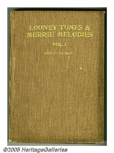 <B>Looney Tunes and Merrie Melodies Comics #1-12 Bound Volume (Dell, 1941-42).</B></I> This group of comics is highlighted by Issue #1, one of the 100 most valuable Golden Age comics according to Overstreet, with the first comic book appearances of Porky Pig, Bugs Bunny, Daffy Duck, and Elmer Fudd! And the other issues offer more of these characters plus plenty of Walt Kelly art. These twelve comics are file copies that were trimmed and bound into one hardcover volume. The comics were obviously in Near Mint condition when bound and remain very attractive today. The page quality averages light tan. Note that the front cover of #1 has a half-inch tear. Approximate Overstreet VG 4.0 value for group = $3,700. <I>From the Random House archives.</B></I>