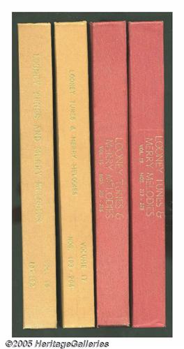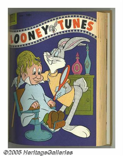 <B>Looney Tunes and Merrie Melodies Comics #181-228 Bound Volumes (Dell, 1956-60).</B></I> More mirthful madness collected together as four bound volumes of vintage <B>Looney Tunes and Merry Melodies Comics</B></I>. Bugs Bunny and company never looked so good as they do in these books, which were originally used by the publisher for office reference. All the comics were file copies that were bound and trimmed for each volume; most of the comics still look like new. Approximate Overstreet VG 4.0 value for group = $400. <I>From the Random House Archives.</B></I>