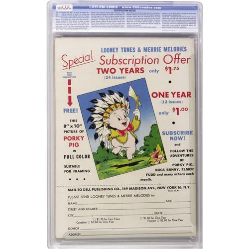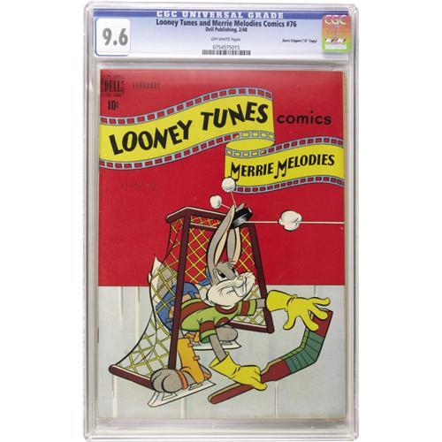 <B>Looney Tunes and Merrie Melodies Comics #76 Davis Crippen ("D" Copy) (Dell, 1948) CGC NM+ 9.6 Off-white pages.</B></I> This is a bright copy with excellent edges. The book has one of the few ice hockey covers we've seen! Overstreet 2006 NM- 9.2 value = $125. CGC census 10/06: 1 in 9.6, none higher. <I>From the Crippen Collection</B></I>.<BR><BR><b>Shipping:</b> Slabbed Comic (<a target="_blank" href="http://www.heritageauctions.com/common/shipping.php">view shipping information</a>)