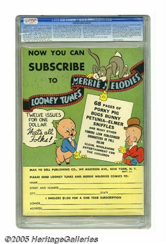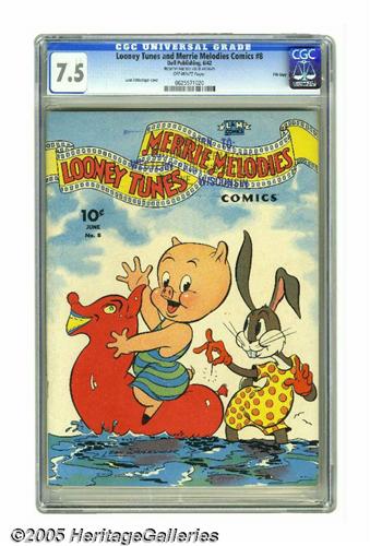 <B>Looney Tunes and Merrie Melodies Comics #8 File Copy (Dell, 1942) CGC VF- 7.5 Off-white pages.</B></I> Walt Kelly art and a Leon Schlesinger cover are two big selling points of this issue. And how about the great condition of this file copy -- it's the highest-graded one CGC has certified to date. Overstreet 2005 VF 8.0 value = $502. CGC census 4/05: 1 in 7.5, none higher. <I>From the Random House Archives.</B></I>