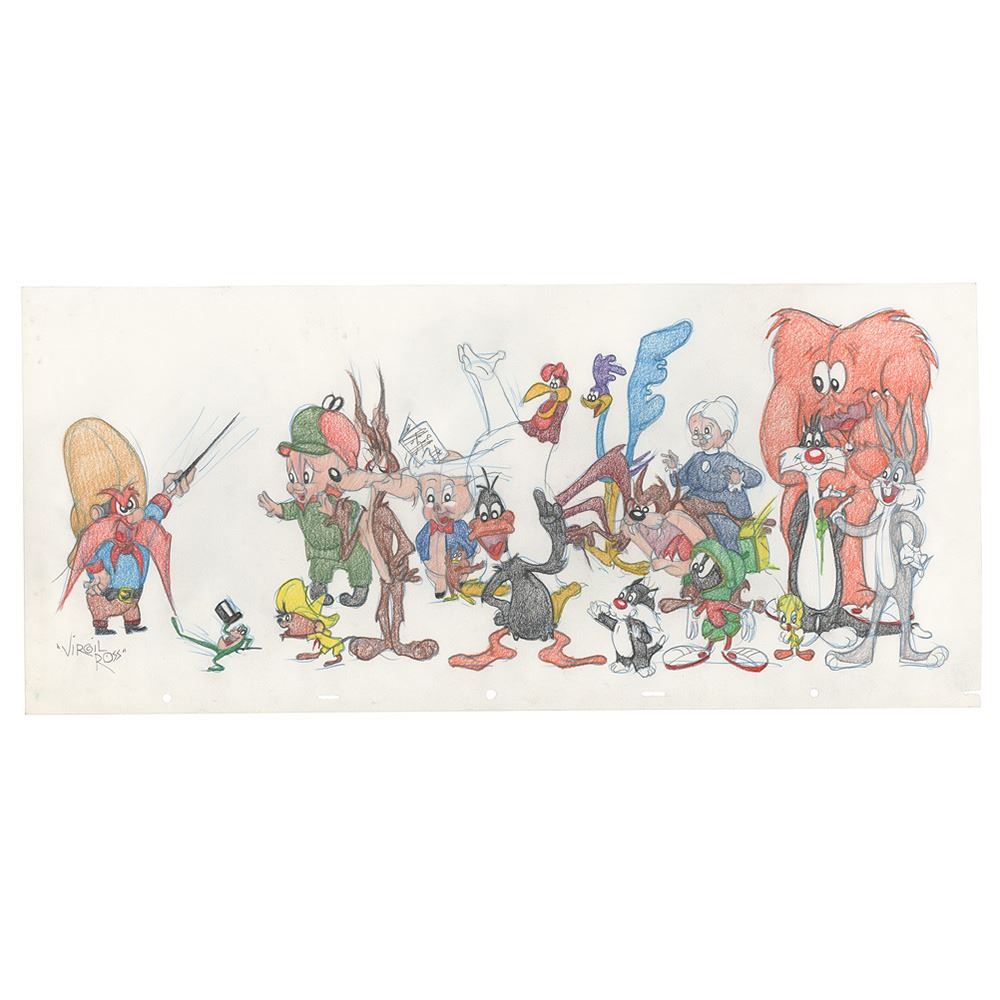 (Warner Brothers Studios, 1990s) Original pan drawing by Virgil Ross featuring a total of 18 classic Looney Tunes characters including Yosemite Sam, Michigan J. Frog, Speedy Gonzales, Elmer Fudd, Wile E. Coyote, Porky Pig, Henery Hawk, Daffy Duck, Foghorn Leghorn, Road Runner, Tweety Bird, Taz, Granny, Sylvester and son, Marvin the Martian, Gossamer, and Bugs Bunny. Accomplished in graphite and colored pencil on untrimmed 23.5 x 10.5 animation paper, signed at the bottom in pencil, "Virgil Ross." In fine condition, with a small tear to right edge. This one-of-a-kind drawing was done to be sold in the Warner Brothers Studio stores in the 1990s—this elaborate example is an especially rare large size.