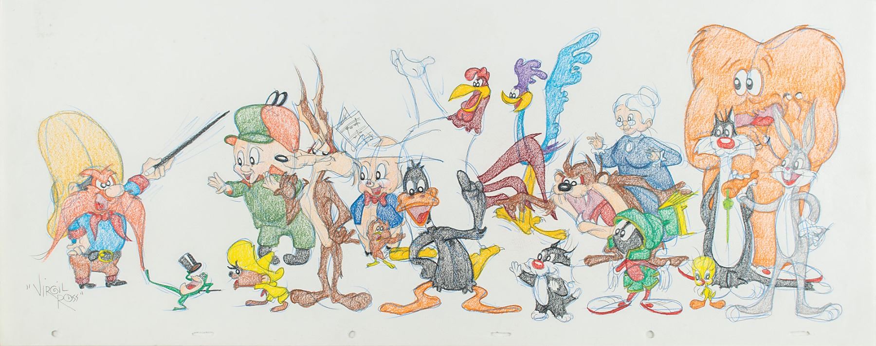 (Warner Brothers Studios, 1990s) Original super-pan drawing by Virgil Ross featuring a total of 18 classic Looney Tunes characters including Yosemite Sam, Michigan J. Frog, Speedy Gonzales, Elmer Fudd, Wile E. Coyote, Porky Pig, Henery Hawk, Daffy Duck, Foghorn Leghorn, Road Runner, Tweety Bird, Taz, Granny, Sylvester and son, Marvin the Martian, Gossamer, and Bugs Bunny. Accomplished in graphite and colored pencil on untrimmed 23.5 x 10.5 animation paper, signed at the bottom in pencil, "Virgil Ross." In fine condition. This one-of-a-kind drawing was done to be sold in the Warner Brothers Studio stores in the 1990s—this elaborate example is an especially rare large size.