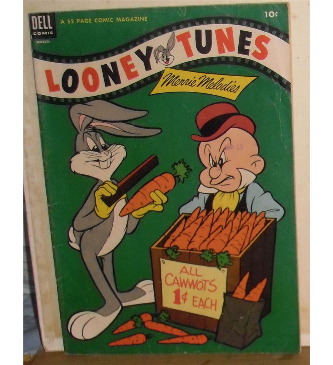 10 cents then is this Dell Comics thick 52 page collectible #149 1954 comic magazine carton characters "Looney Tunes" - 'Merrie Melodies' you saw at the Cinema or on TV - with many cartoon stories: 1-Bugs Bunny; 2- Porky Pig; 3- Elmer Fudd & Daffy; 4- Mary Jane & Sniffles; 5- Henry Hawk; 6- Tweety & Sylvester; Pancho Vanilla; with advertising by Milky Way, Whitman Books, Wheaties "Spark Up to get a clear shot says Bob Davies" basketball with an singed like card-player on back cover; pages are near mint and all interior pages are MINT as yet to be read; add to your collection, or start one; or use as an interesting gift for many not matter what age !