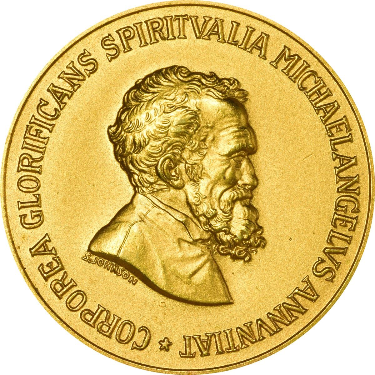Dies: as illustrated above, signed S. JOHNSON at truncation. Mattelike mustard-gold throughout with softly embedded luster. No doubt struck for Italy’s Italia Lines, on the occasion of their new pride and joy Michelangelo’s maiden voyage on September 16, 1962. Hallmarked and stamped 750 at 4 o’clock beneath the ship’s prow. This medal should prove popular with bidders who enjoy nautical items.