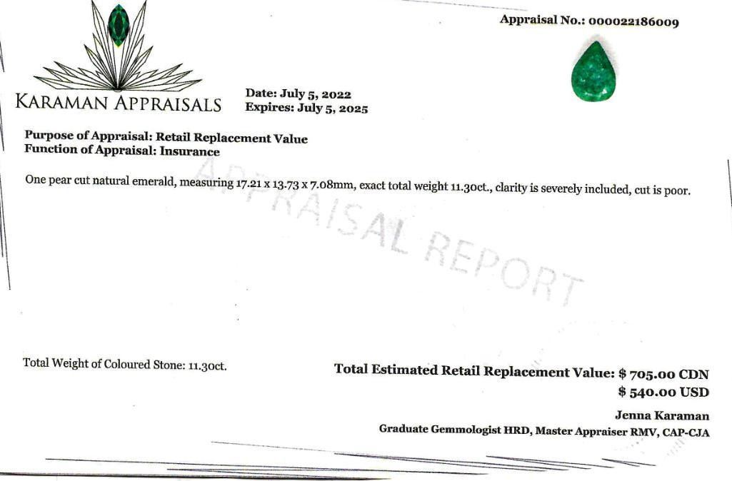Loose Gemstone - exact total weight 11.3ct., One pear cut natural emerald, Appraisal: $705