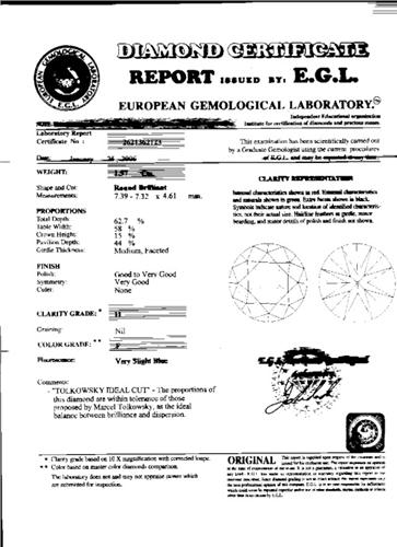 Loose diamond Round brilliant cut 1.57Ct Clarity I1 Color F EGL cert