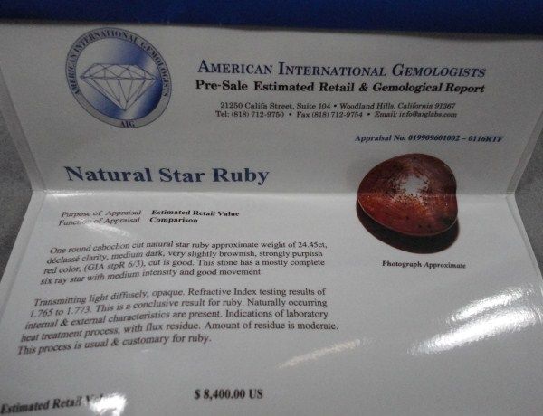24.45 Ct round cabochon cut natural star ruby . declasse' clarity, Estimated retail value on certificate is $8400.00