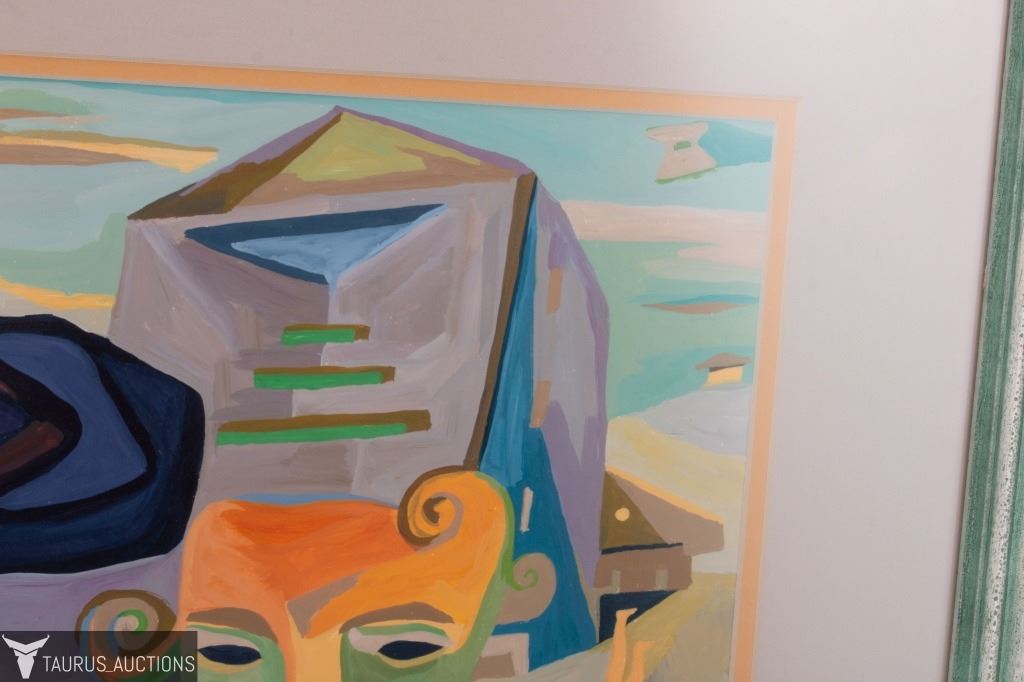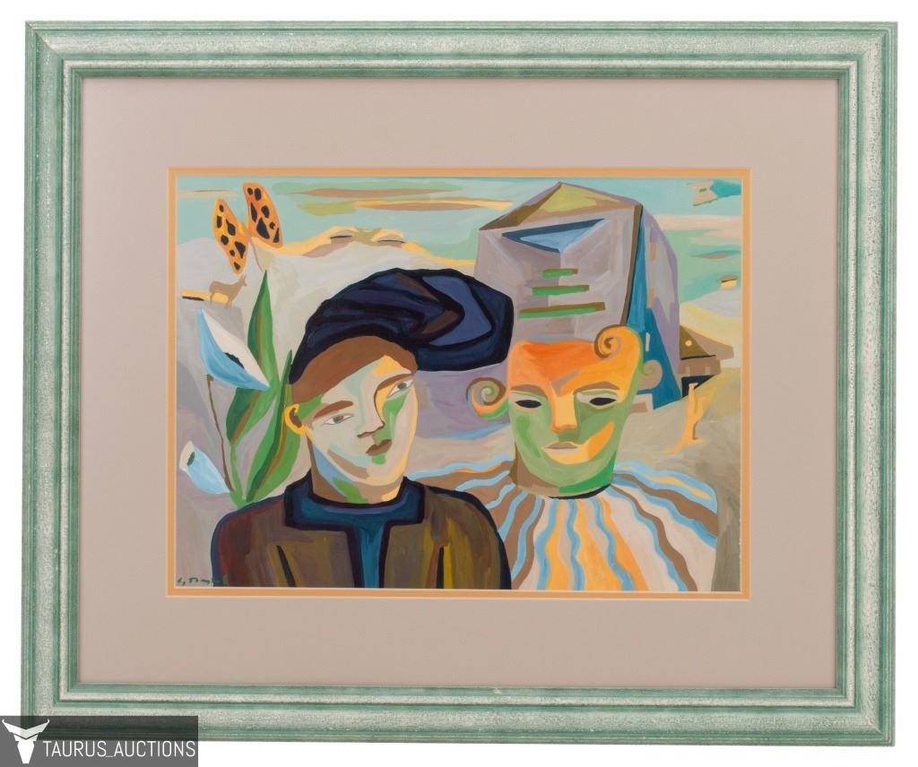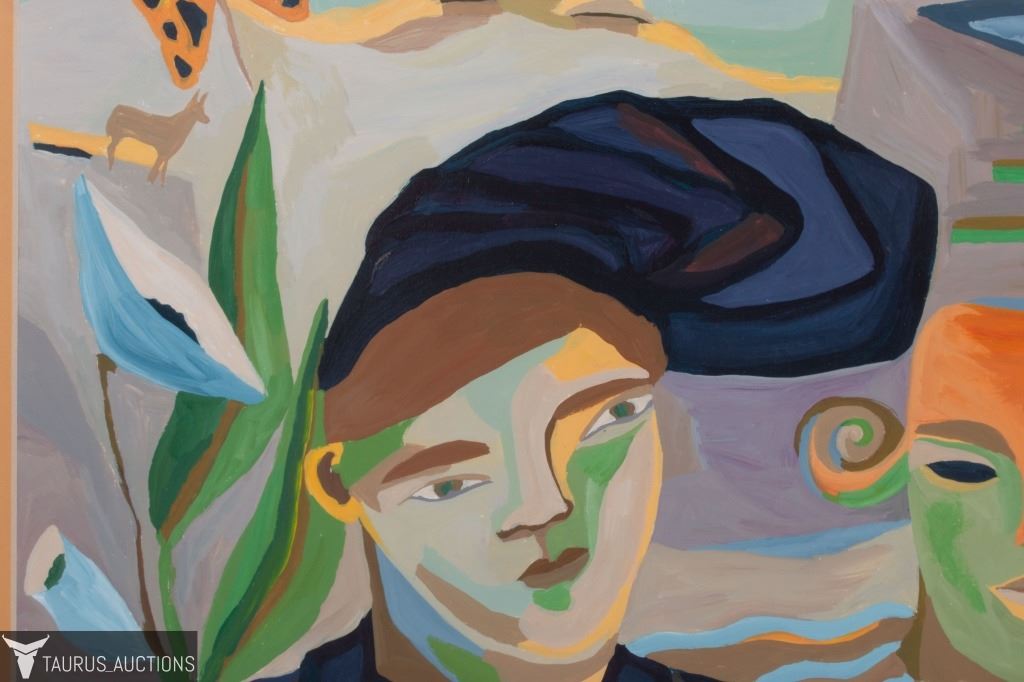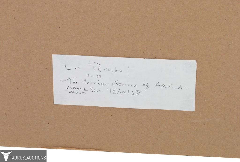 Item/Description: Original painting features colorful figures in hats. Signed lower left. Label adhered to back reads in part: Lor Roybal / 11-92 / The Morning Glories of Aquila. (Abstract Expressionist Portrait, Modernism, Folk Art)
