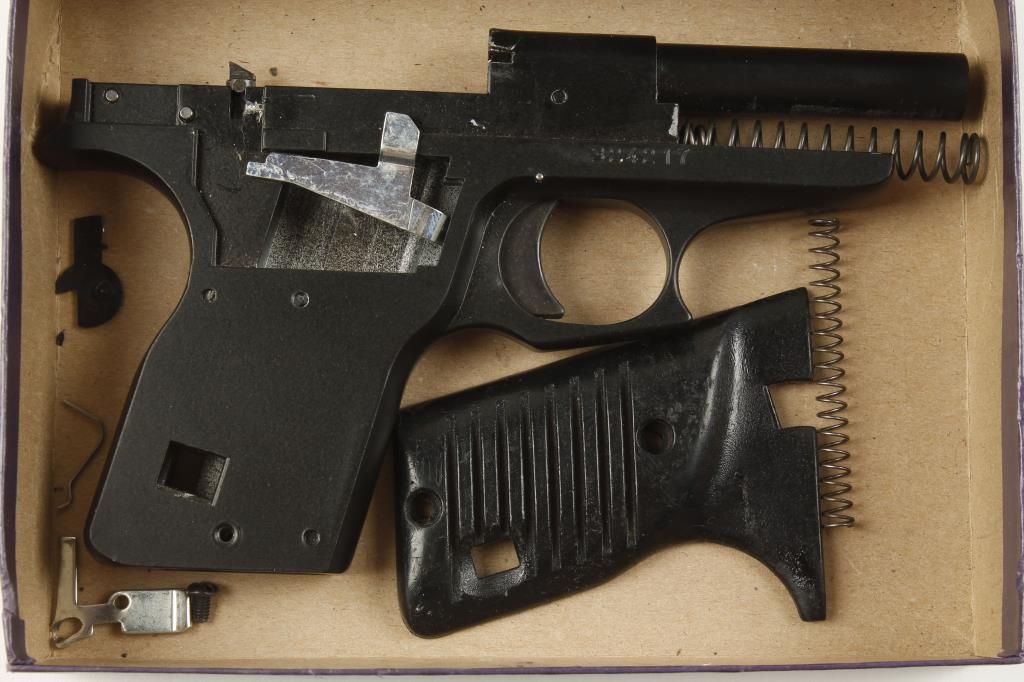 Missing slide, magazine, and grip. To be used for parts only. Includes box and no magazine.