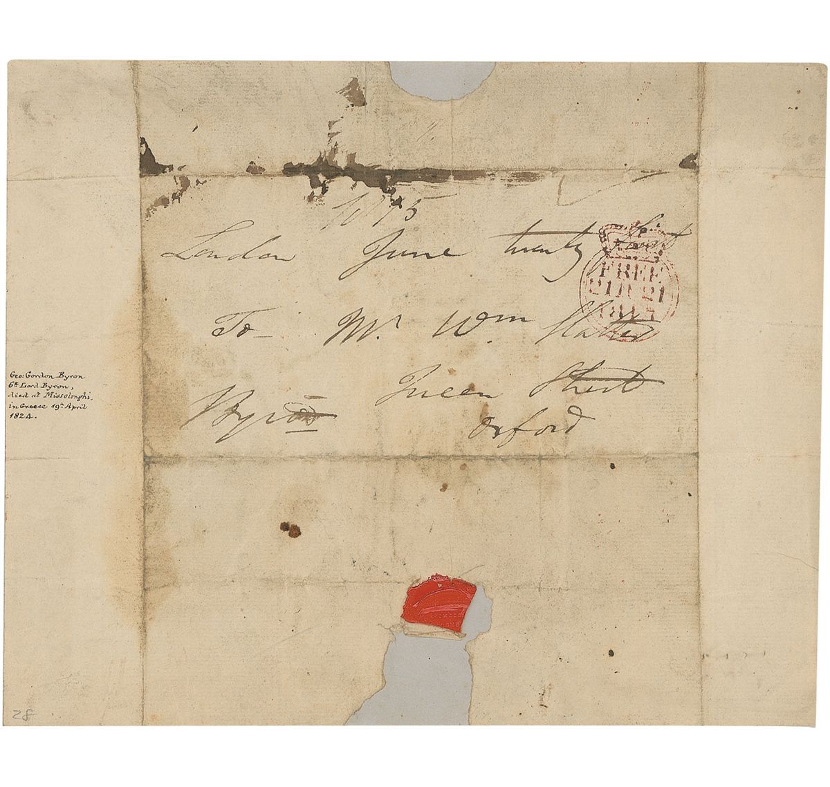 Highly influential British poet, politician, soldier, and adventurer, sexual and otherwise (1788–1824), who takes a place as the most colorful literary figure of the Romantic era. His works include such classics as Childe Harold’s Pilgrimage and Don Juan. Hand-addressed free frank, measuring 9.5 x 7 overall, with the address panel measuring 6 x 3, addressed by Byron, “London June twenty first, to Mr. Wm. Flatter, Queen Shirt, Oxford,” and franked in the lower left, “Byron,” and stamped “Free” in the upper right. Sheet is affixed to an identical size sheet. Paper loss to top and bottom edge from wax seal, scattered soiling to panel, several folds and creases, and an ink notation to left edge, otherwise very good condition.