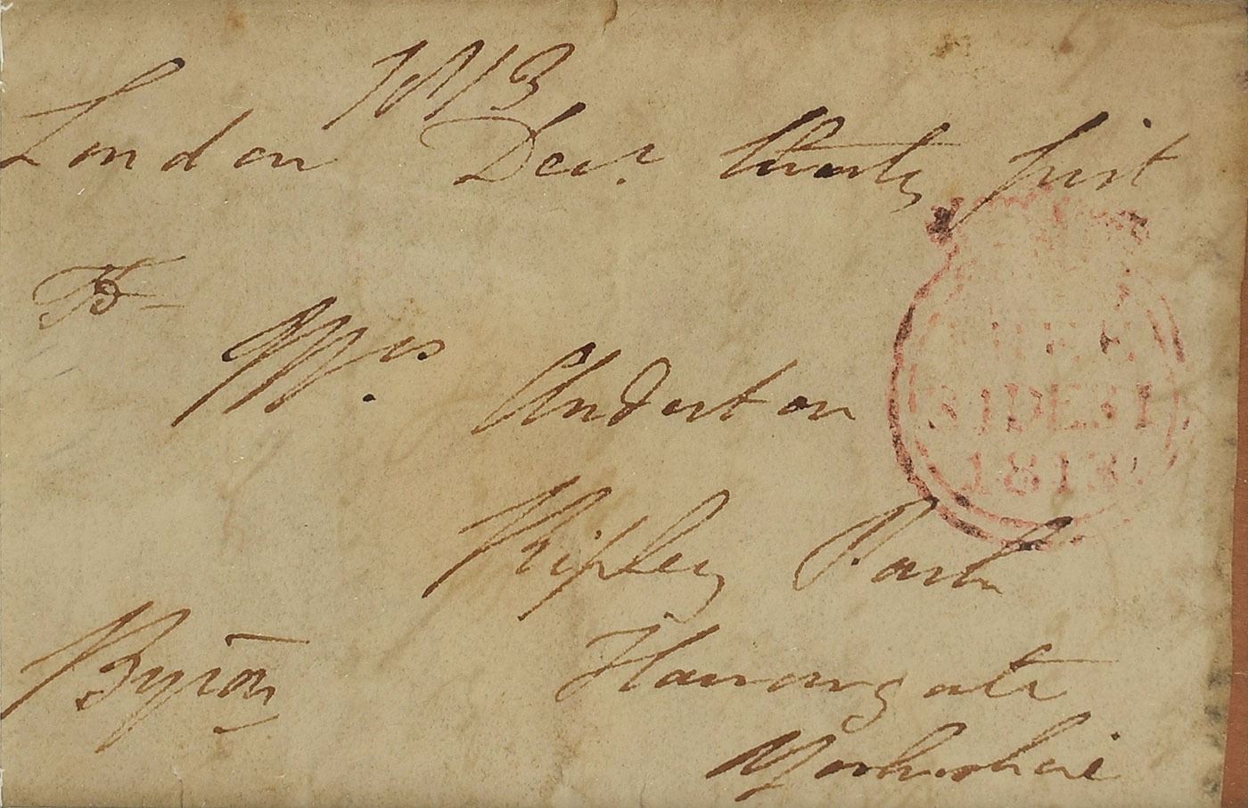 Free franked address panel, 4.25 x 2.75, addressed by Byron, “London, 1813 Dec'r twenty first, To Mrs. Anderton,” and franked in the lower left corner, “Byron.” Double-matted and framed with a portrait and nameplate (which has become detached from the mount) to an overall size of 10.5 x 16. In very good to fine condition, with light overall soiling.