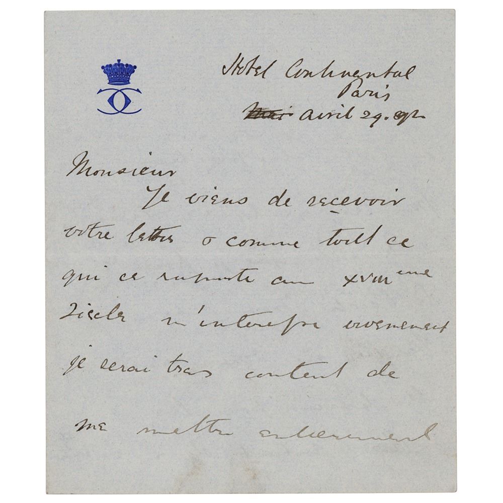 English aristocrat (1866–1923) and amateur Egyptologist best known as the financier of Howard Carter's excavation of Tutankhamun's tomb. ALS in French, signed “Carnarvon,” three pages, 4.5 x 5.25, personal letterhead, April 24, 1892. Handwritten letter with some commentary on his art collection, in full (translated): "I have just received your letter, and as everything relating to the 18th century interests me I will be very happy to put myself entirely at your disposal for the few drawings, paintings etc. that I own from the French School. Please tell me if the designs for the books are within your scope and also what details you need. I will be in London within 15 days from where I will send you what I can." In fine condition.