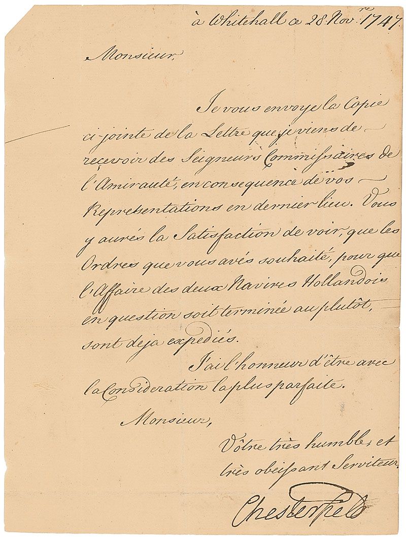 LS in French, signed “Chesterfield,” one page, 7 x 9.25, November 28, 1747. Letter to an unidentified gentleman confirming that the Admiralty has informed him that his correspondent’s instructions regarding the question of the two Dutch ships have been duly received. Intersecting folds, several passing through signature, clipped top left corner, and some light toning and soiling, otherwise fine condition.