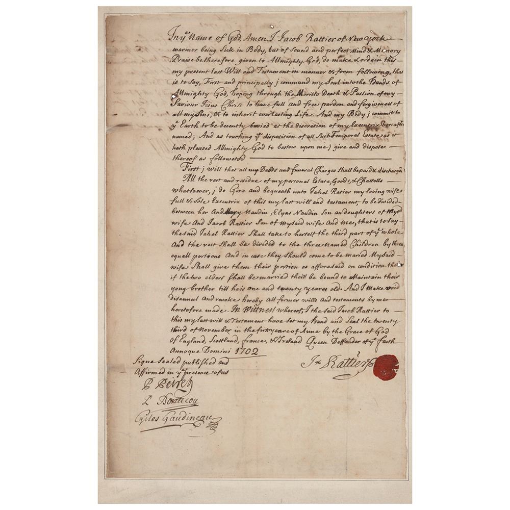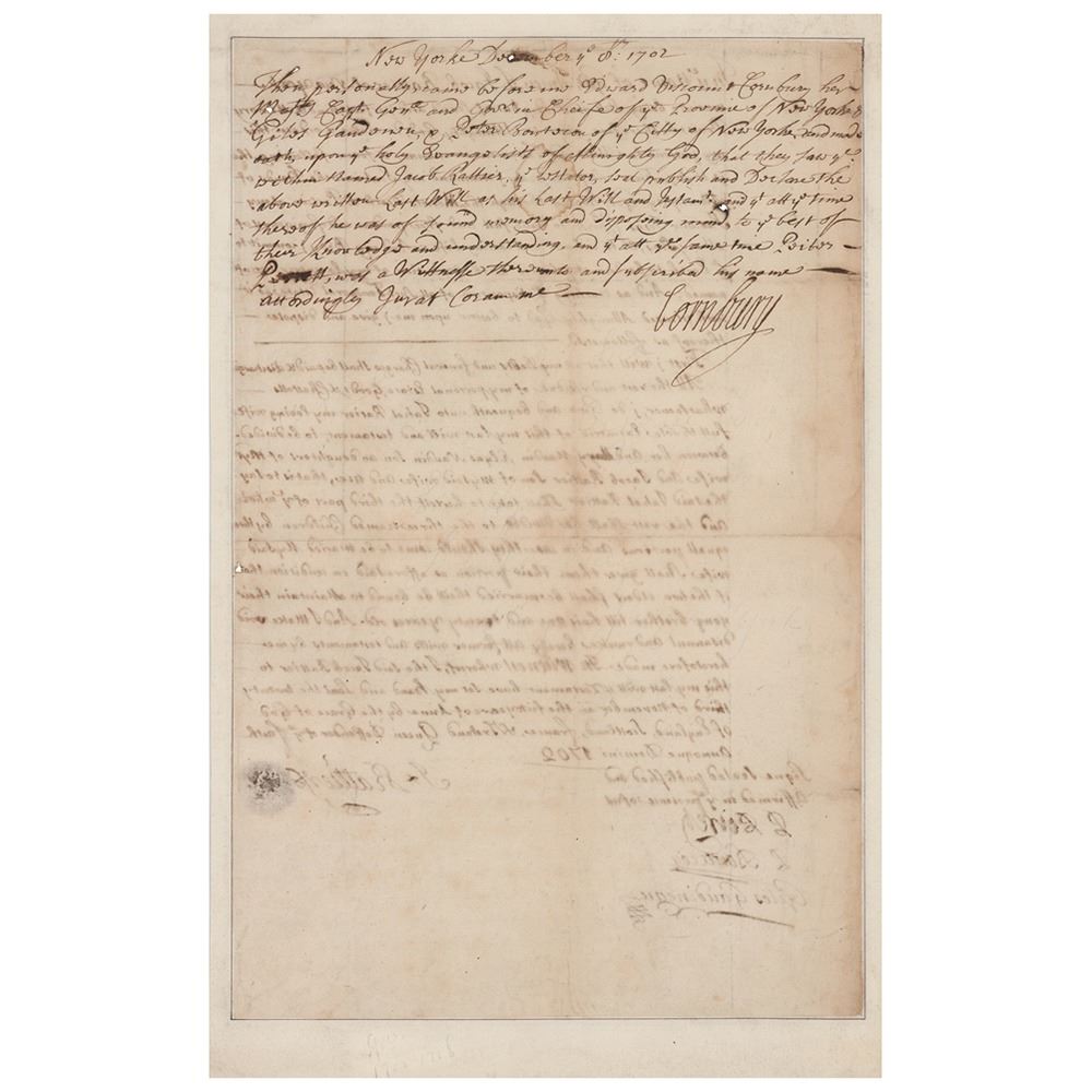 Manuscript DS, signed “Cornbury,†one page both sides, 8.25 x 12.75, December 4, 1702. Last will and testament of Jacob Rattier, a Huguenot mariner who died shortly after executing this document, signed on the front by Rattier and three witnesses including Giles Gaudineau, a local early French New York doctor; endorsed on the reverse as a witness by the newly appointed governor, Edward Hyde, 3rd Earl of Clarendon, better known by his noble title, Lord Cornbury. Professionally inlaid into a slightly larger sheet and in fine condition.