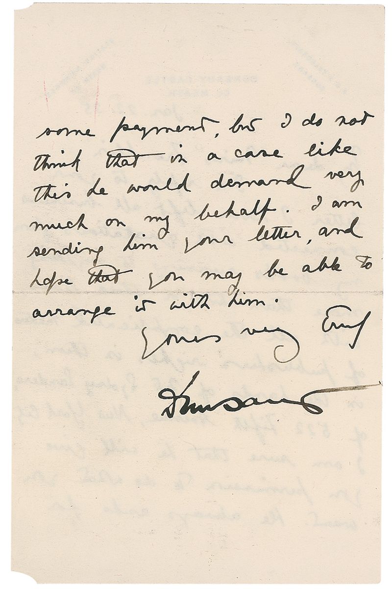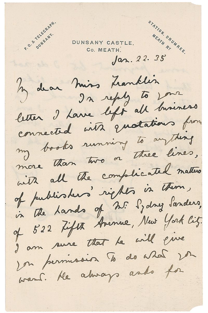 Edward John Moreton Drax Plunkett, 18th Baron of Dunsany, Irish writer and dramatist (1878–1957) notable for his work, mostly in fantasy, published under the name Lord Dunsany. ALS signed “Dunsany,” one page both sides, 4.5 x 7, Dunsany Castle letterhead, January 22, 1935. Letter to Miss Franklin. In part: “I have left all business connected with quotations from my books running to anything more than two or three lines, with all the complicated matters of publisher’s rights in them, in the hands of W. Sydney Sanders…I am sure that he will give you permission to do what you want.” In fine condition, with a bit of light toning and missing lower right corner tip.