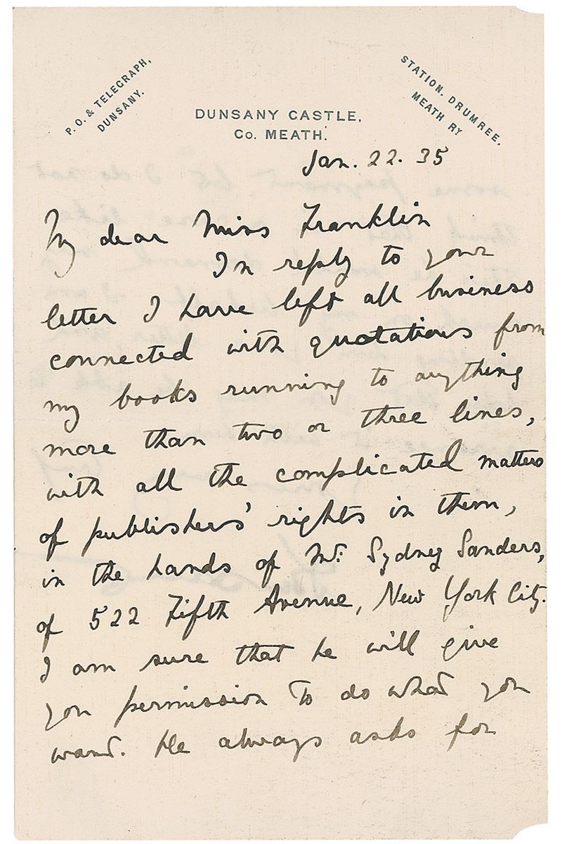 Edward John Moreton Drax Plunkett, 18th Baron of Dunsany, Irish writer and dramatist (1878–1957) notable for his work, mostly in fantasy, published under the name Lord Dunsany. ALS signed “Dunsany,” one page both sides, 4.5 x 7, Dunsany Castle letterhead, January 22, 1935. Letter to Miss Franklin. In part: “I have left all business connected with quotations from my books running to anything more than two or three lines, with all the complicated matters of publisher’s rights in them, in the hands of W. Sydney Sanders…I am sure that he will give you permission to do what you want.” In fine condition, with a bit of light toning and missing lower right corner tip.
