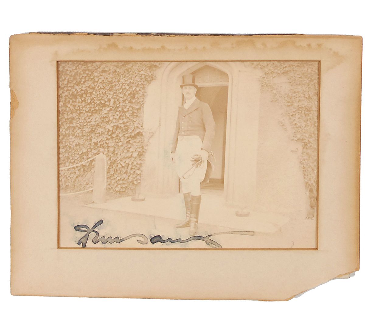Edward John Moreton Drax Plunkett, 18th Baron of Dunsany, Irish writer and dramatist (1878–1957) notable for his work, mostly in fantasy, published under the name Lord Dunsany. Vintage matte-finish 6 x 4.25 photo of Dunsany standing outdoors in his riding gear by A. H. Poole, signed in black ink, “Dunsany.” In very good condition, with scattered running of ink to signature from moisture, photograph uniformly faded, and missing lower right corner to the dampstained mat.