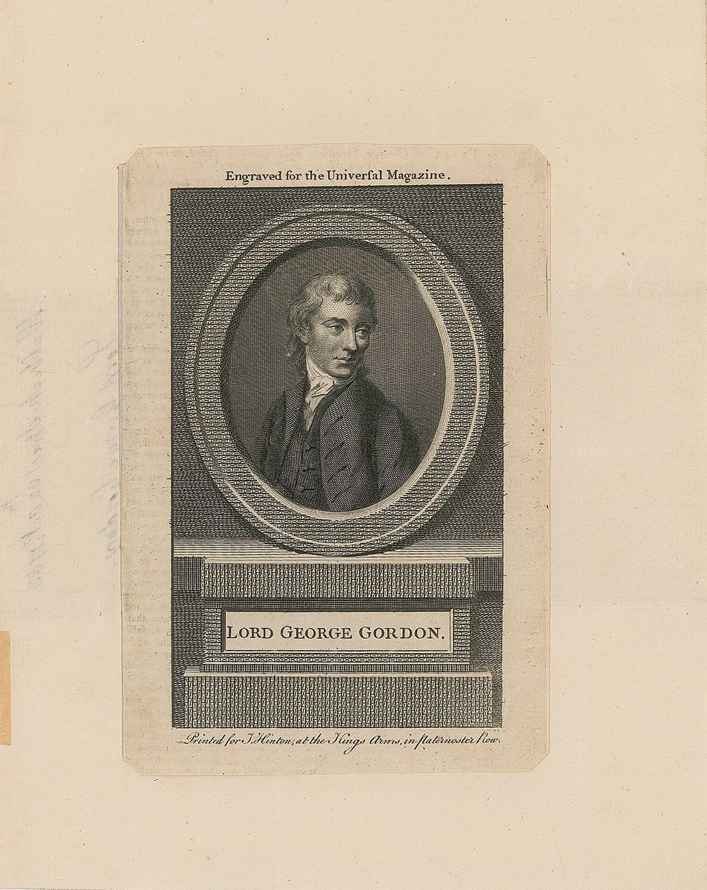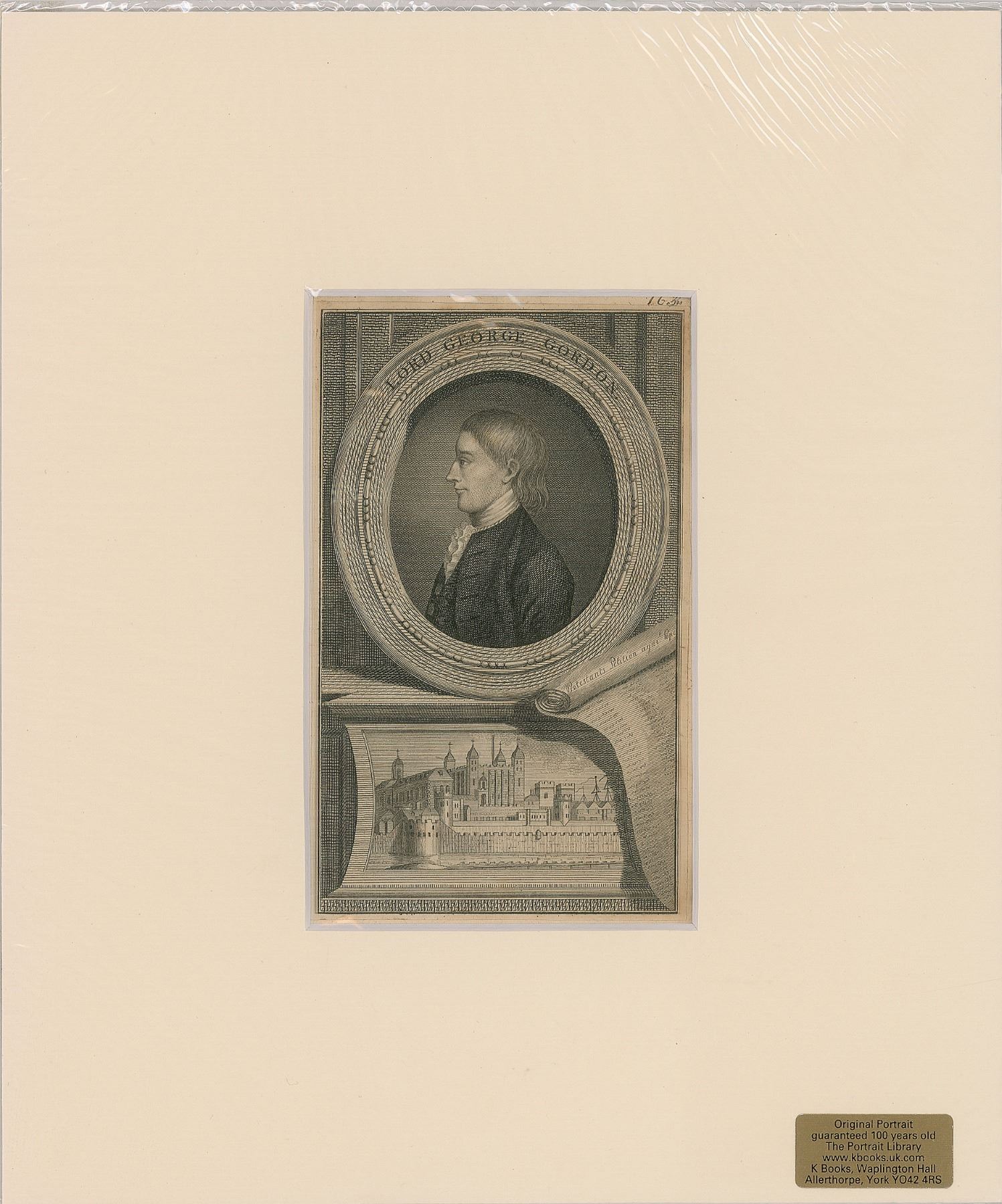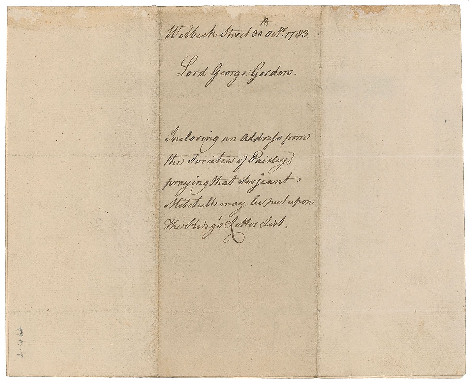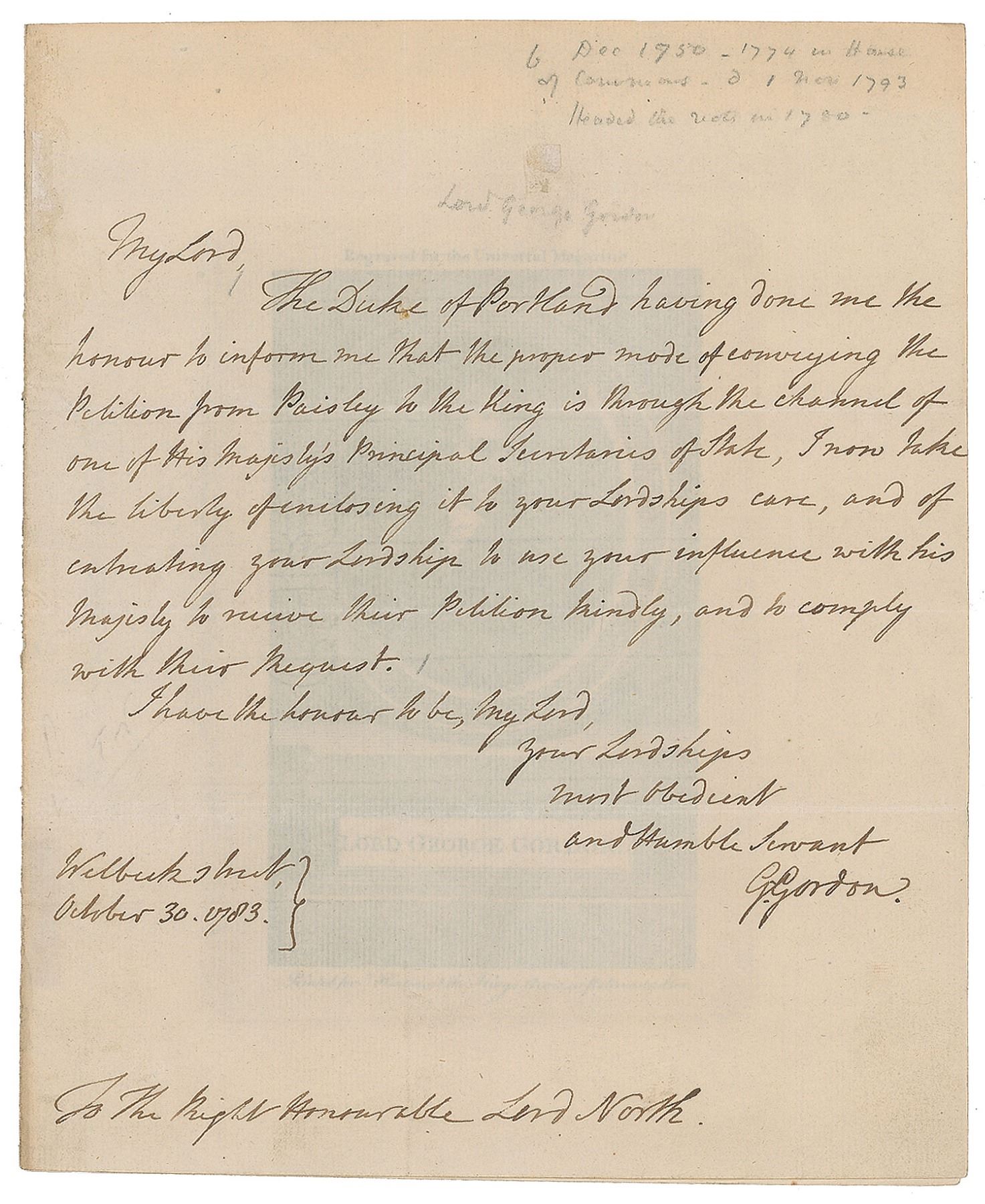 ALS signed “G. Gordon,” one page, 7.25 x 8.75, October 30, 1783. Letter to Lord North, in part: "The Duke of Portland having done me the honour to inform me that the proper mode of conveying the Petition from Paisley to the King is through the channel of one of His Majesty's Principal Secretaries of State, I now take the liberty of enclosing it to your Lordship's care, and of entreating your Lordship to use your influence with his Majesty to receive their Petition kindly, and to comply with their Request." In fine condition, with an old piece of tape to the inner hinge, and an engraving of Gordon inside on the integral address leaf. Accompanied by a second engraved portrait of Gordon, matted to an overall size of 10 x 12.